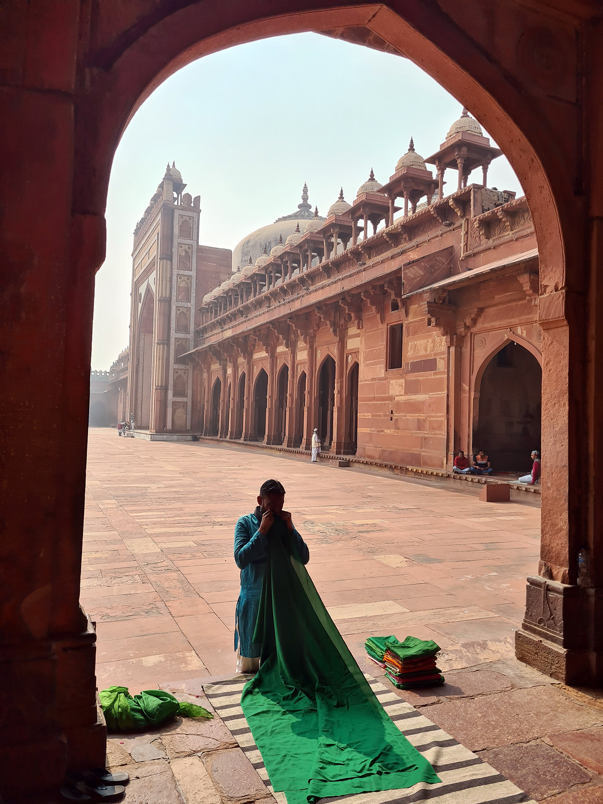 За Буланд Дарвазой перед пятничной мечетью простирается площадь 130 на 165 метров. Там достаточно места для десяти тысяч молящихся, а здание мечети — это уже сложный и изысканный «бирьяни». Оно не похоже ни на одно тимуридское или ближневосточное строение и носит черты архитектуры только что завоеванного Акбаром Гуджарата, прибрежной области на западе Индии, где когда-то осели бежавшие от мусульман иранские зороастрийцы (их потомок Фаррух Булсара прославится как Фредди Меркьюри).
