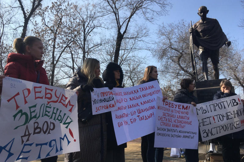29 февраля в Алма-Ате гражданские активисты провели разрешенный митинг против уплотняющей застройки. Он состоялся в специально отведенном властями месте – в парке имени Ганди, передает корреспондент «Ферганы».