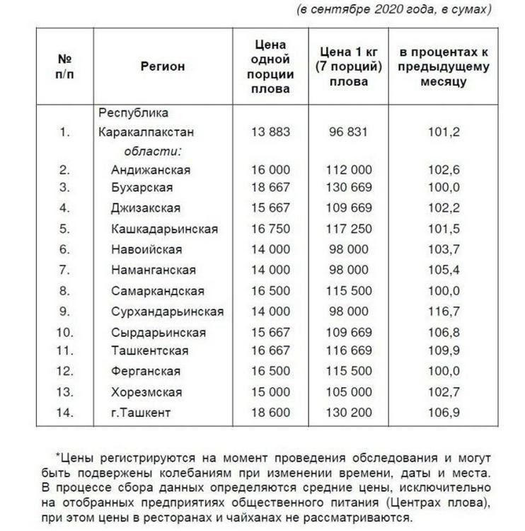 «По результатам выборочных наблюдений Госкомстата, — говорится в распространенном 30 сентября пресс-релизе, — на предприятиях общественного питания (Центрах плова) центральных регионов страны зарегистрированы следующие средние цены на плов: