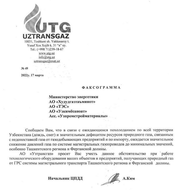 Между тем факсограмма, оказавшаяся в распоряжении Kun.uz, свидетельствует о том, что еще 17 марта «Узтрансгаз» предупредил о вероятности «снижения давления газа по системе магистральных газопроводов до минимальных значений, особенно в Ташкентской области и Ферганской долине».