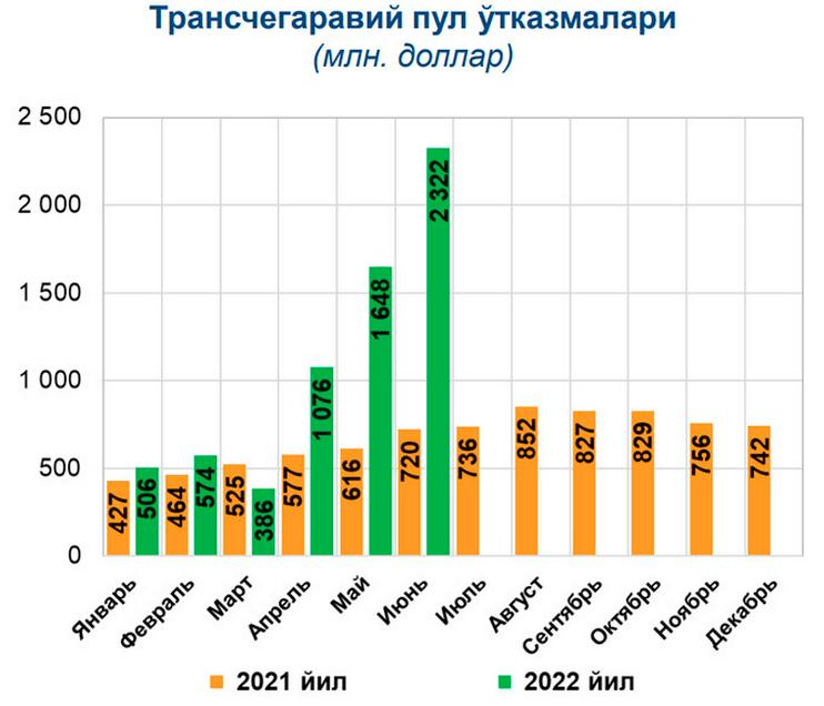 В апреле из-за рубежа в Узбекистан поступило $1,07 млрд, что почти вдвое превышает показатель аналогичного периода прошлого года. В мае переведено $1,65 млрд (рост в 2,7 раза), в июне — $2,32 млрд (рост в 3,25 раза).