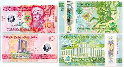 Банкноты в 10 и 200 туркменских манатов. Фото с сайта turkmenistan.gov.tm