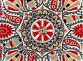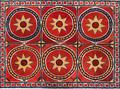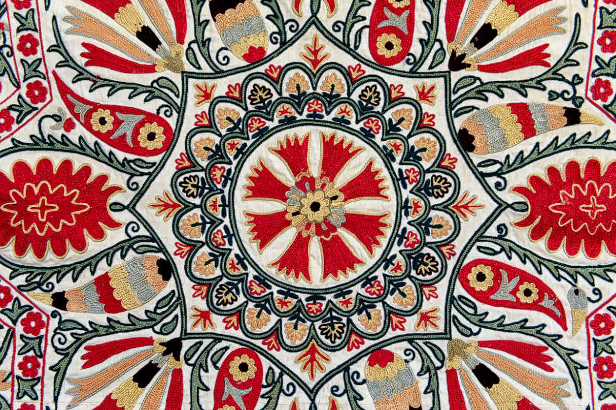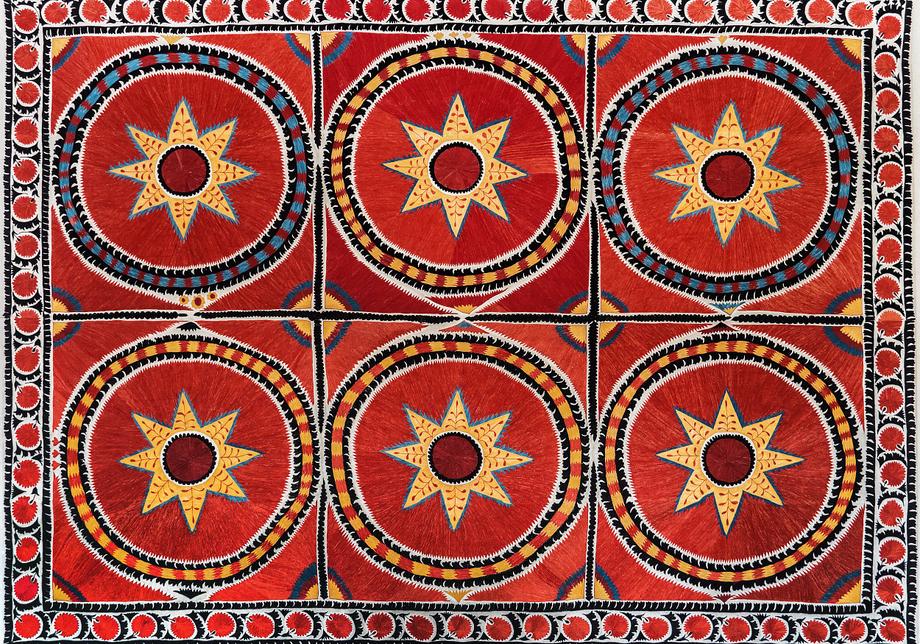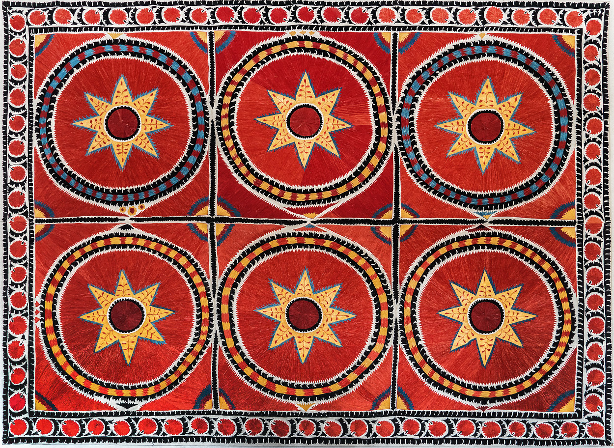 Мадина Касымбаева посвятила 26 лет возрождению традиций ташкентских сюзане паляк (от согдийского слова falak – небесный свод). Это самый сложный вид сюзане, в котором плотной ручной вышивкой заполняется вся поверхность ткани. Главная тема орнамента — яркие концентрические круги, символизирующие солнце в зените. На полотне можно увидеть также стилизованные звезды и ветви растений с цветами и плодами. Ткань адрас и нити для вышивки изготавливаются вручную из натуральных волокон шелка и хлопка в равных пропорциях. Красители извлекаются из растений и природных минералов, поэтому цвета на изделиях не тускнеют десятилетиями.